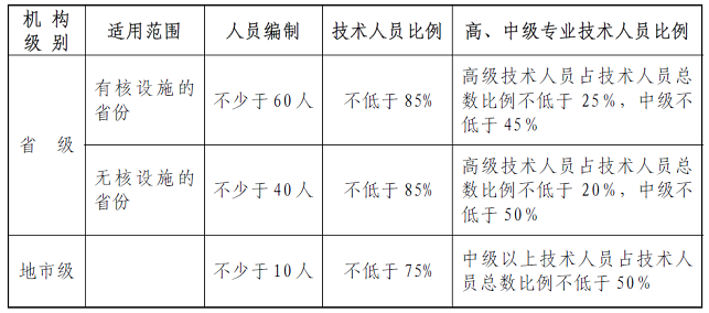 为指导和规范全国各级辐射环境监测与监察机构能力建设,建立先进的辐射环境监测预警体系和完备的辐射环境执法监督体系,加强核与辐射安全监管,特制定本标准。全国辐射环境监测与监察机构共分四级:国家级、省级、地市级、县级,其中省级辐射环境监测与监察机构分为辖区内有核设施的省份和辖区内无核设施的省份两类。本标准规定了省级、地市级辐射环境监测与监察机构人员编制标准及结构、工作经费、业务用房、基本仪器设备配置、核与辐射事故应急专用设备配置、专项辐射环境监测仪器配置。本标准为最低配置标准,有能力的地区可以适当提高标准。国家级辐射环境监测与监察机构的建设标准另行规定,县级辐射环境监测与监察机构的建设标准暂不作统一要求。若辐射环境监测与监察机构还承担核与辐射安全行政许可技术审查、科研等其它职能,所需配备的相应人力、经费、用房、仪器设备等软硬件条件要求不含在此标准范围内。