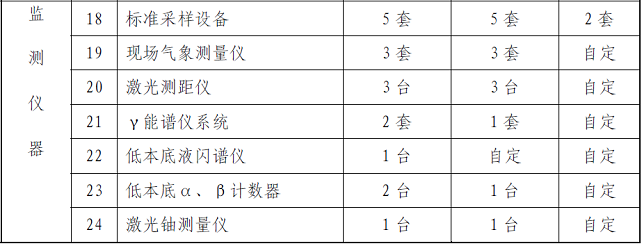 基本仪器设备是保障辐射环境监测与监察机构开展辐射环境质量监测(包括土壤、空气、水体、生物样品、陆地、口岸、海洋、电磁等项目的环境质量监测)、核设施和辐射源监督性监测(包括各类核设施、铀矿冶、放射性废物处理处置设施、电磁辐射设施、放射性同位素与射线装置、伴生放射性矿等)、日常核与辐射安全监督检查和执法的基础条件。辐射环境监测与监察机构必须配置的仪器设备的最低配备标准见表4。